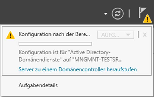 - Um den Server zum Domaincontroller heraufstufen zu können muss man im Server-Manager oben rechts auf die Flagge mit dem gelben Warnsymbol klicken